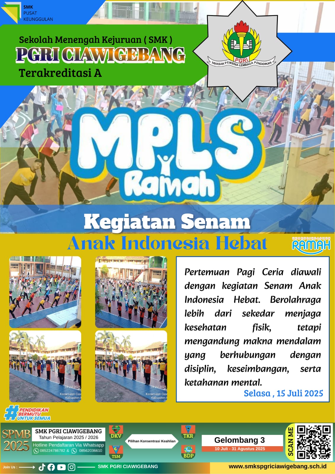 Assalamualaikum Warahmatullahi Wabarakatuh, Selamat pagi, salam sejahtera bagi kita semua. Puji syukur kehadirat Allah SWT, Tuhan Yang Maha Esa, atas rahmat dan karunia-Nya, kita dapat berkumpul di sini dalam keadaan sehat walafiat untuk melaksanakan kegiatan MPLS (Masa Pengenalan Lingkungan Sekolah) bagi siswa-siswi baru. Selamat datang di SMK PGRI Ciawigebang, tempat kalian akan menimba ilmu, mengembangkan potensi diri, dan meraih cita-cita. Kami, seluruh keluarga besar SMK PGRI Ciawigebang, menyambut...