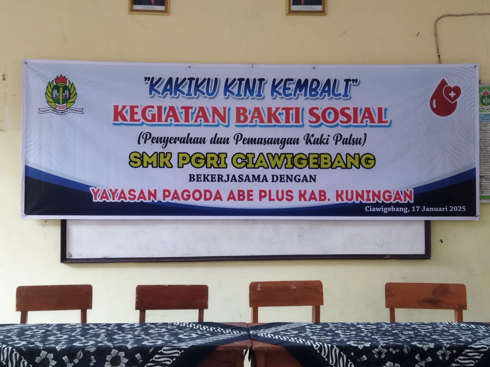 Kepala sekolah SMK PGRI Ciawigebang Drs Sugiono selaku kepala mengadakan bakti sosial kaki palsu di kampus SMK PGRI ciawigebang dan bekerja sama dengan Yayasan pagoda ABE Plus Kabupaten Kuningan kegiatan ini menjadi wujud nyata kepedulian kampus SMK PGRI Ciawigebang yuang terletak di Jl. Susukan Kecamatan Ciawigebang / belakang Polsek ciawigebang, sekaligus momentum berbagi kebahagiaan bagi mereka yang mendapatkan kaki paslu dan sembako bagi mereka yang...