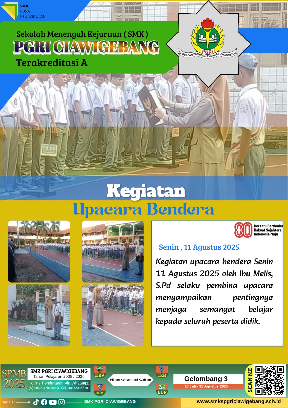 Kegiatan upacara bendera dilaksanakan, mulai pada pukul 06.30 sampai dengan pukul 07.30 . Sebagai pembina upacara bendera Aris arisna . selaku kepala program teknik sepeda motor. Sementara itu, semua guru dan staf TU mengikuti upacara bendera. Dalam rangkaian isi amanat, bapak kepala sekolah dapat dikutip, sebagai berikut. Upacara bendera setiap hari Senin merupakan kegiatan wajib yang harus dilaksanakan oleh seluruh sekolah, baik sekolah negeri maupun...