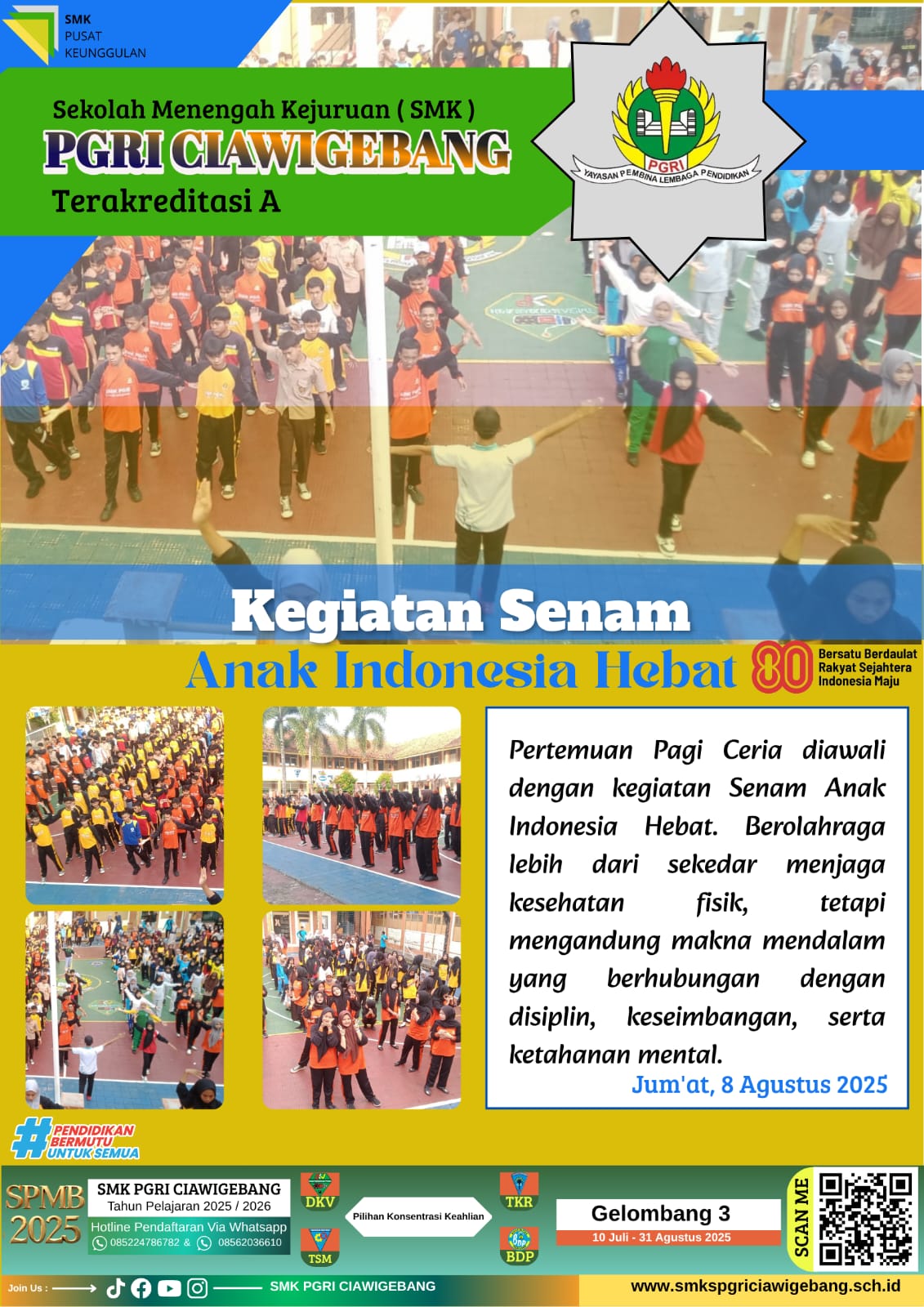 Senam di Hari Jum’at Yang Penuh Berkah Senam mempunyai banyak manfaat bagi kesehatan tubuh kita, baik kesehatan fisik maupun kesehatan psikis, hari ini Jum’at SMK PGRI Ciawigebang melaksanakan kegiatan senam bersama bapak , ibu guru,staf tata usaha dan sisiwa smk pgri ciawigebang di lapangan olah raga di sekolah beberapa manfaat senam bagi kesehatan al: Memperkuat otot tangan dan kaki, dalam senam sebagian besar gerakannya tertumpu pada kaki...